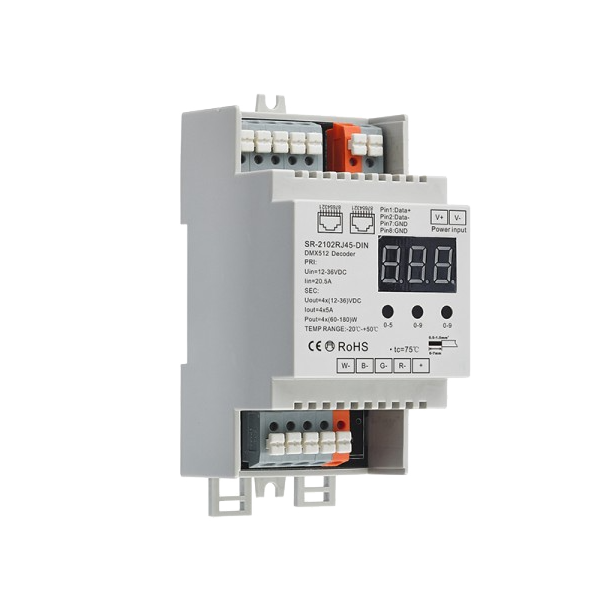 Ο SR-2102RJ45-DIN είναι ένας αποκωδικοποιητής DMX512 τοποθετημένος σε ράγα, σχεδιασμένος με θύρα RJ45, η οποία μπορεί να συνδεθεί με WIFI και bluetooth, μπορεί να είναι τηλεχειριζόμενος RF ή να προγραμματιστεί για IOS/Android μέσω WIFI μέσω ενός DMX master SR-2817dmx ή SR-2816. Ο αποκωδικοποιητής DMX μπορεί να εναλλάσσεται μεταξύ εξόδων 3 ή 4 καναλιών. Ρεύμα εξόδου έως 5A ανά κανάλι. Η διεύθυνση DMX μπορεί να ρυθμιστεί ελεύθερα και να εμφανιστεί στην οθόνη. Οι αποκωδικοποιητές DMX512 τοποθετημένοι σε ράγα din μπορούν να είναι συμβατοί με τους DMX master μας, όπως SR-2811DMX, SR-2201DMX, SR-2812, SR-2816 και άλλους.