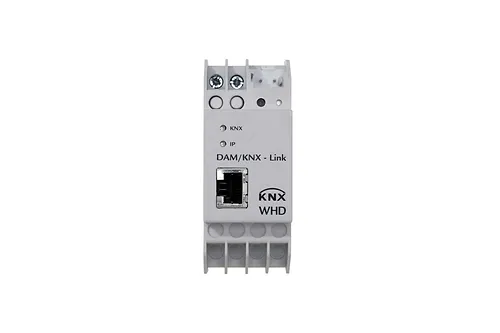 Διεπαφή πιστοποιημένη με KNX και IP-address για έλεγχο DAM. Ο σύνδεσμος DAM-KNX επιτρέπει τον έλεγχο έως και 10 ζωνών DAM χρησιμοποιώντας αισθητήρες πληκτρολογίου KNX. Ένας δεύτερος σύνδεσμος KNX μπορεί να χρησιμοποιηθεί για τον έλεγχο έως και 20 ζωνών DAM. Βίσμα RJ 45 για σύνδεση της κύριας μονάδας DAM 6000. Οι ακόλουθες λειτουργίες μπορούν να πραγματοποιηθούν χρησιμοποιώντας αισθητήρες KNX: (επιλογή) Ζώνη On / Off, ένταση, επιλογή πηγής, σίγαση, έλεγχος τόνου, εκπομπή ζώνης και παράκαμψη προτεραιότητας, έλεγχος συνδεδεμένων πηγών μέσω IR.
