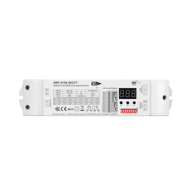 Το SRP-2108-50CCT είναι ένα driver LED DMX με δυνατότητα ρύθμισης φωτεινότητας 50W, με έξοδο σταθερού ρεύματος 2 καναλιών και ρυθμιζόμενο ρεύμα από 250mA έως 1500mA μέσω διακοπτών DIP, γεγονός που το καθιστά κατάλληλο για φώτα LED CCT με διαφορετικό ρεύμα. Είναι σχεδιασμένο με είσοδο 200-240VAC. Ο συντελεστής ισχύος του driver μπορεί να είναι πάνω από 0,93 και η απόδοση είναι υψηλότερη από 86%. Επιτρέπει ομαλή και βαθιά ρύθμιση φωτεινότητας έως 0,1% χωρίς τρεμόπαιγμα και θόρυβο βόμβου. Οι διευθύνσεις DMX μπορούν να αντιστοιχιστούν χειροκίνητα μέσω κουμπιών και να εμφανιστούν στην οθόνη. Συμμορφούμενο με τα πρότυπα DMX512(2008) και DMX512-A, αυτό το driver LED είναι συμβατό με παντός τύπου κύριους ελεγκτές DMX.
