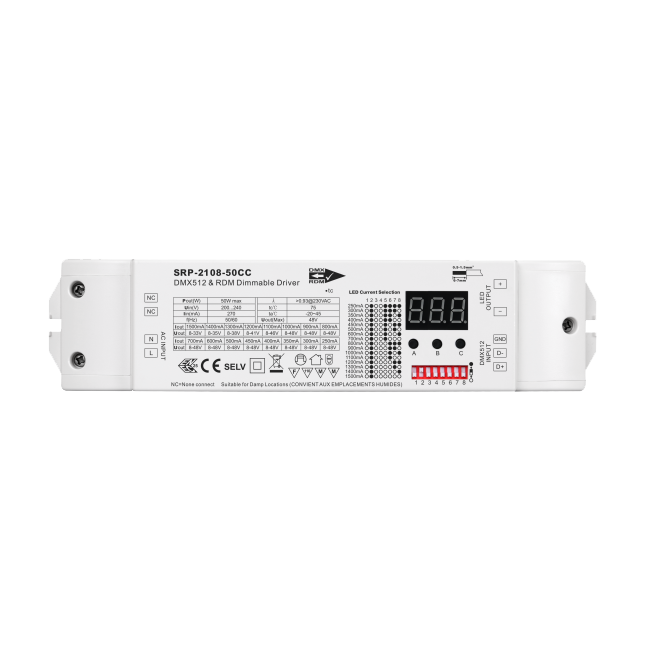 Το SRP-2108-50CC είναι ένα driver LED DMX με δυνατότητα ρύθμισης φωτεινότητας 50w με έξοδο σταθερού ρεύματος 1 καναλιού και ρυθμιζόμενο ρεύμα από 250ma έως 1500ma μέσω διακοπτών DIP, γεγονός που το καθιστά κατάλληλο για φώτα LED με διαφορετικό ρεύμα. Είναι σχεδιασμένο με είσοδο 200-240VAC. Ο συντελεστής ισχύος του driver μπορεί να είναι πάνω από 0,93 και η απόδοση είναι υψηλότερη από 86%. Επιτρέπει ομαλή και βαθιά ρύθμιση φωτεινότητας έως 0,1% χωρίς τρεμόπαιγμα και θόρυβο βόμβου. Η διεύθυνση DMX μπορεί να αντιστοιχιστεί χειροκίνητα μέσω κουμπιών και να εμφανιστεί σε ψηφιακή οθόνη. Συμμορφούμενο με τα πρότυπα DMX512(2008) και DMX512-A, αυτό το driver LED είναι συμβατό με παντός τύπου κύριους ελεγκτές DMX.