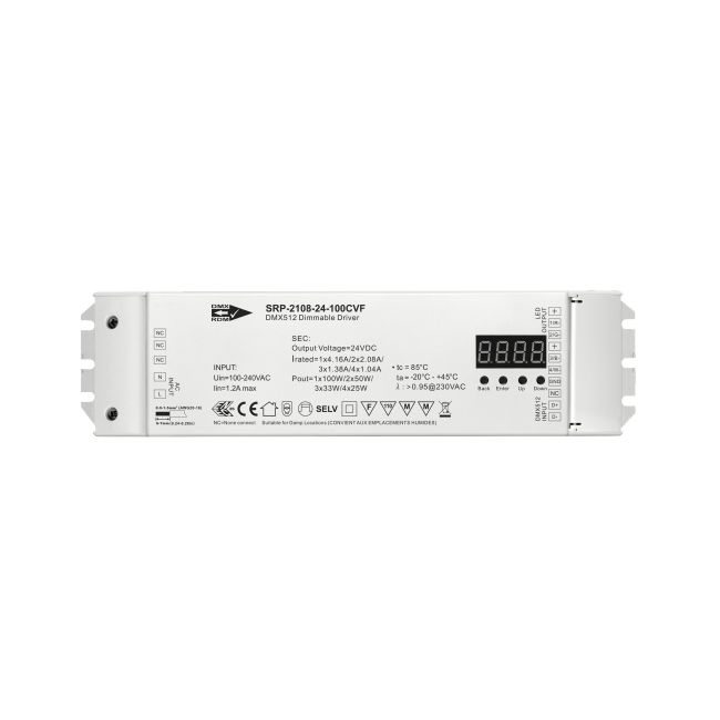 Το SRP-2108-24-100CVF είναι ένα πρόγραμμα οδήγησης LED DMX 100W με δυνατότητα ρύθμισης φωτεινότητας, εγκεκριμένο από UL, ENEC και TUV, με δυνατότητα RDM, με 4 κανάλια σταθερής τάσης εξόδου 24VDC και καθολική είσοδο 100-277VAC. Ο συντελεστής ισχύος του προγράμματος οδήγησης μπορεί να είναι πάνω από 0,9 και η απόδοση είναι υψηλότερη από 90%. Επιτρέπει ομαλή και βαθιά ρύθμιση φωτεινότητας έως 0,1% χωρίς τρεμόπαιγμα και θόρυβο βόμβου. Η ποσότητα καναλιού DMX μπορεί να οριστεί ως 1/2/3/4 μέσω κουμπιών, γεγονός που επιτρέπει στο πρόγραμμα οδήγησης να ελέγχει μονόχρωμο, ρυθμιζόμενο λευκό φωτισμό LED RGB/RGBW. Οι διευθύνσεις DMX μπορούν να αντιστοιχιστούν χειροκίνητα μέσω κουμπιών και να εμφανιστούν σε ψηφιακή οθόνη. Συμμορφούμενο με τα πρωτόκολλα DMX512(2008), DMX512-A και RDM V1.0 (E1.20-2006 ESTA Standard), αυτό το πρόγραμμα οδήγησης DMX είναι συμβατό με καθολικές κονσόλες DMX. Η πιστοποίηση UL, ENEC και TUV εξασφαλίζει υψηλή απόδοση ασφαλείας του οδηγού που θα χρησιμοποιείται παγκοσμίως.