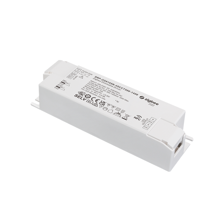 Ο SRP-ZG9105N-45CCT500-1400 είναι ένας NFC Dimmable 45W LED Driver με 2 κανάλια σταθερού ρεύματος εξόδου και ρυθμιζόμενο ρεύμα από 500mA έως 1400mA, που τον καθιστά κατάλληλο για φωτιστικά LED σταθερού ρεύματος με διαφορετικές απαιτήσεις. Λειτουργεί με τάση εισόδου 220-240VAC. Ο συντελεστής ισχύος είναι πάνω από 0.94 και η απόδοση πάνω από 87%. Προσφέρει ομαλό και βαθύ dimming έως 0.1% χωρίς τρεμόπαιγμα ή θόρυβο. Ο driver είναι σχεδιασμένος με ZigBee διεπαφή και μπορεί να συνδεθεί σε δίκτυο ZigBee και να ελεγχθεί από ελεγκτή ή hub. Είναι συμβατός με γενικούς ZigBee gateway ή coordinator. Υποστηρίζει TouchLink commissioning για απευθείας σύνδεση με ZigBee remotes. Η συσκευή βασίζεται στο ZigBee 3.0 και μπορεί να ελεγχθεί από έως 30 ZigBee remotes που υποστηρίζουν σύνδεση μέσω TouchLink. Υποστηρίζει επίσης ZigBee green power feature, επιτρέποντας τον έλεγχο από έως 20 ZigBee green power remotes χωρίς hub ή gateway.