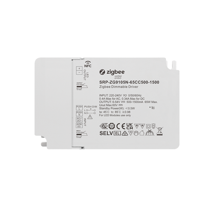 Ο SRP-ZG9105N-45CC500-1500 είναι ένας NFC Dimmable LED Driver 45W με 1 κανάλι σταθερού ρεύματος εξόδου και δυνατότητα ρύθμισης ρεύματος από 500mA έως 1500mA, κατάλληλος για φωτιστικά LED σταθερού ρεύματος με διαφορετικές απαιτήσεις. Σχεδιασμένος για τάση εισόδου 220-240VAC, διαθέτει συντελεστή ισχύος πάνω από 0.94 και απόδοση άνω του 87%. Παρέχει ομαλό και βαθύ dimming έως 0.1%, χωρίς τρεμόπαιγμα ή θόρυβο λειτουργίας. Ο οδηγός διαθέτει διεπαφή ελέγχου ZigBee, μπορεί να συνδεθεί σε δίκτυο ZigBee και να ελεγχθεί μέσω του ελεγκτή ή του hub. Είναι συμβατός με όλα τα ZigBee gateway ή coordinators της αγοράς. Επιπλέον, υποστηρίζει TouchLink commissioning, επιτρέποντας την απευθείας σύζευξη με ZigBee τηλεχειριστήρια για έλεγχο χωρίς ενδιάμεσο hub. Η συσκευή βασίζεται στο πρωτόκολλο ZigBee 3.0 και μπορεί να ελεγχθεί από έως 30 ZigBee τηλεχειριστήρια που υποστηρίζουν ZigBee Light Link μέσω TouchLink. Υποστηρίζει επίσης τη λειτουργία ZigBee Green Power, επιτρέποντας τη σύζευξη και τον έλεγχο από έως 20 ZigBee Green Power τηλεχειριστήρια ή διακόπτες, χωρίς την ανάγκη ZigBee hub ή gateway.