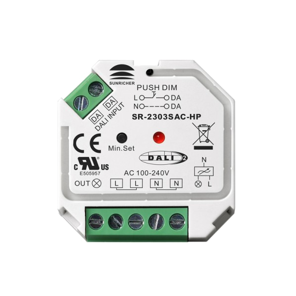 Το SR-2303SAC-HP είναι ένα καινοτόμο dimmer διακοπής φάσης AC με διεπαφή DALI και ελέγχου push. Το dimmer AC έχει σχεδιαστεί με είσοδο και έξοδο ευρείας ζώνης 100-240VAC, 1 κανάλι και μέγιστη έξοδο 400W. Το dimmer φάσης DALI υιοθετεί ρύθμιση έντασης trailing edge. Η καινοτόμος λειτουργία ρύθμισης ελάχιστης φωτεινότητας επιτρέπει στους χρήστες να ορίσουν μια ελάχιστη φωτεινότητα και να ρυθμίσουν την ένταση από αυτήν την ελάχιστη φωτεινότητα στο 100% της φωτεινότητας. Επίσης, είναι εύκολο να διαγράψετε την ελάχιστη φωτεινότητα. Το dimmer AC μπορεί να είναι συμβατό με συστήματα DALI γενικής χρήσης. Είναι ελεγχόμενο από τον κύριο ελεγκτή DALI ή με έναν υπάρχοντα διακόπτη push button ακόμα και χωρίς σύστημα DALI.